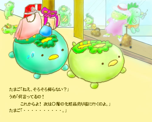 たまごちゃんがうめちゃんの買い物に付き合わされています。
